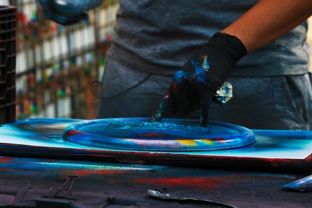 Hands of a young unrecognizable man pouring paint into a spray paint gun tank in his workshop. Close up view.