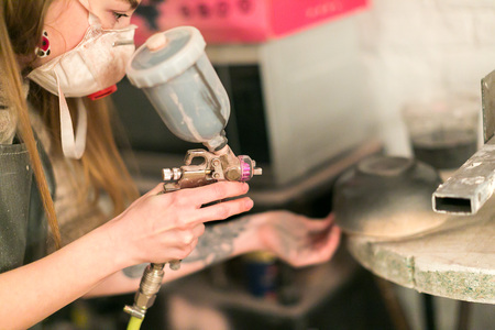 pottery, creating, equipment concept. close up of professional equipment for applying glaze on the ceramic bowl, it is in arms of young girl wearing respirator for protection
