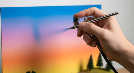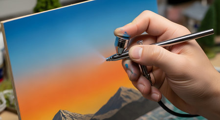 A close-up of an artist's hand holding a chrome airbrush, spraying a fine mist of paint to create a smooth gradient sunset on a diorama or canvas. This image captures the precision and technique of airbrushing as a creative hobby or professional art form.
