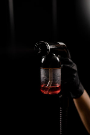 Close-up of instant tanning equipment in the hands of a master. Gun spraying paint for leather against black background