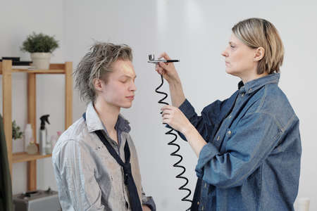 Blond female beautician in casualwear holding electric makeup appliance in front of businessman face