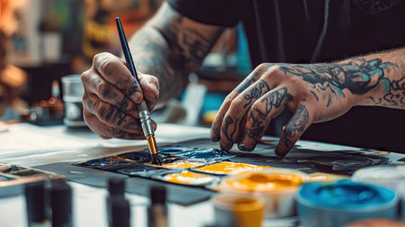 Artist mixing inks on a palette to achieve the perfect custom shade for a tattoo design