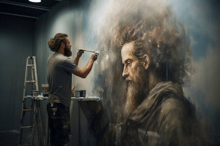 a male artist paints a large picture, a portrait of a man. art artists generative ai.