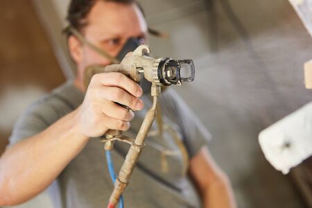 Detail of a spray gun in action. Applying lacquer or paint onto sheet metal surface using a compressed air paint gun.