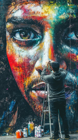 A street artist climbs a ladder, skillfully applying paint to a large, colorful mural featuring a close-up face. The urban setting reflects creativity and passion during early morning hours.