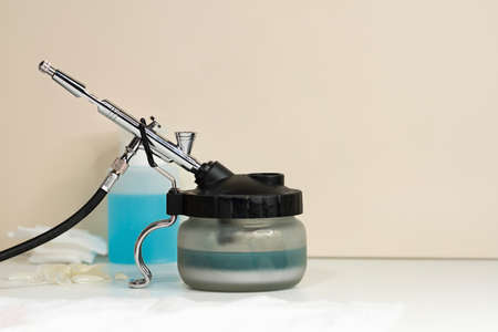Professional Nail Airbrush On A Light Backgroung. Tools For Manicure. Airbrush Work. Jar With Holder For Cleaning Airbrush. Copy Space