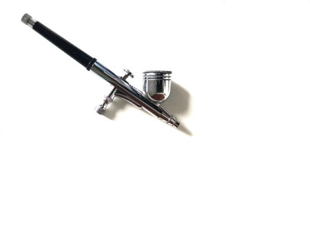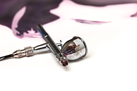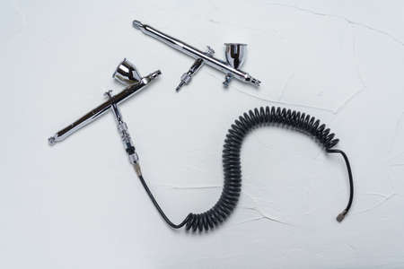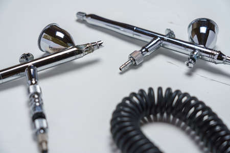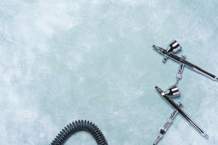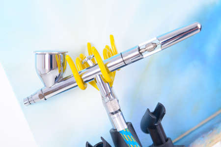 Airbrush tool and paints still life on dark background. Close-up, shallow depth of field