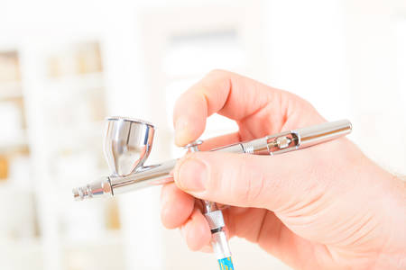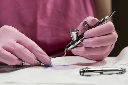 Manicure Master Mixes Paints in Airbrush Before Spraying. New Hobby Creative Creativity