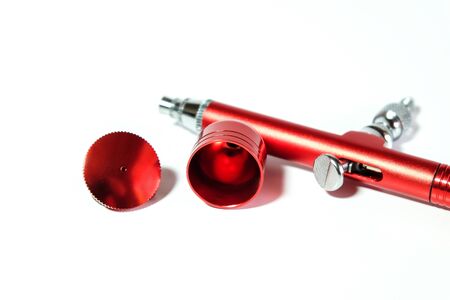 Professional Air Brush in Manicure Master Hand. Airbrush cleaning. Brushes and other airbrush cleaning tools. Copy space for text