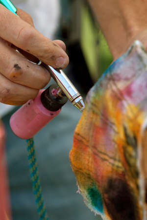 Closeup of air brush gun spraying paint onto rag, as artist prepares to paint someone's face