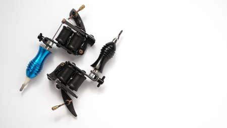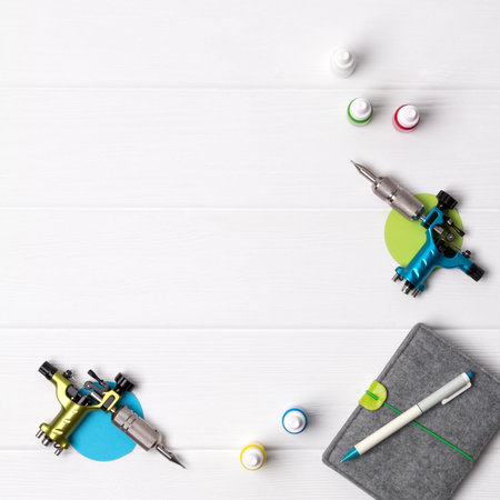 Tattoo masters workplace: tattoo machines, notepad and inks on white wooden background. Tattooing artist studio concept. Flat lay top view copy space