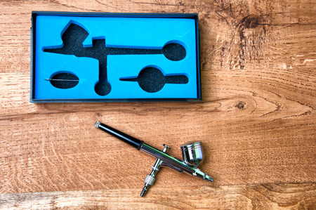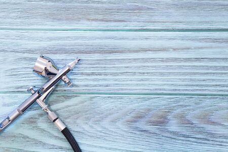 Spray paint gun resting on a workshop table. Detail of a real workspace, composition with copy space.