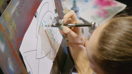 Woman artist learns to paint with airbrush with acrylic dye, paper and easel. Concept modern art, airbrushing, aerography, graffiti, aerosol spray