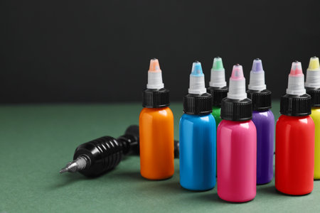 Tattoo machine and colorful inks on dark green table against black background, closeup