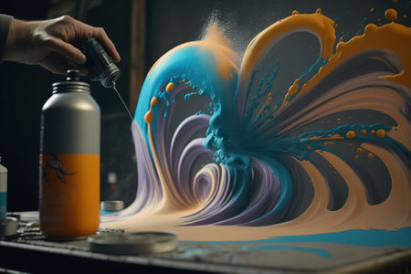 Spray bottle mockup with colored paint. Place for text on a dark background. The hand sprays in the air. AI generated.