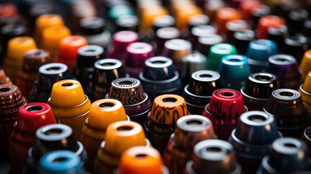 A conceptual photograph featuring fuel tanks arranged in a visually appealing pattern, emphasizing their colors and designs. --ar 3:2 --v 6 Job ID: fc7708e9-9607-4328-9841-bdd709933a43