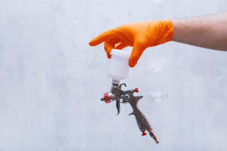 Professional hand wearing orange protective glove holding spray gun with paint cup on a concrete background. Industrial painting equipment for automotive, construction