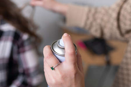 Stylist fixes curls with hairspray. high quality photo