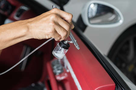 car worker and auto mechanic working and painting a red car using spray gun and compressor