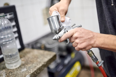 Hands of an unrecognizable worker cleaning the tank of a spray paint gun in his workshop. Close up view.