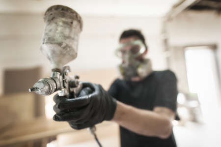 close-up of spray gun getting paint over timber. Young painter renovating