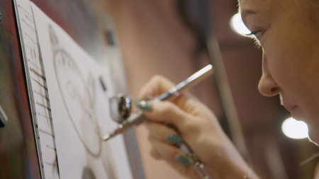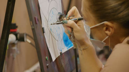 Woman artist learns to paint with airbrush with acrylic dye, paper and easel. Concept modern art, airbrushing, aerography, graffiti, aerosol spray