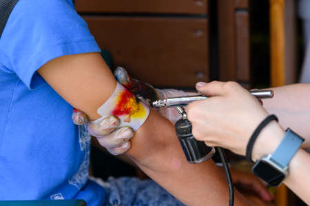 Painter working with airbrush and paints colorful paint concept