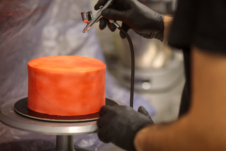 cook preparing a red frosted cake using air bush
