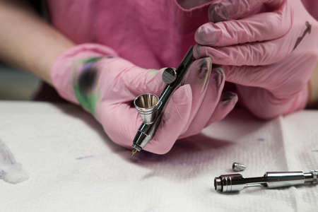 the tattoo artist prepares for the procedure of permanent makeup wraps the pigment holder with a film