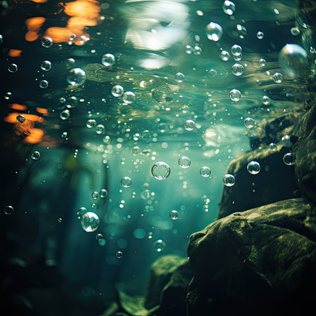 Clear blue water is filled with numerous bubbles that float gracefully reflecting light and creating a mesmerizing visual effect. This scene evokes calmness and peace.