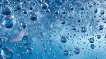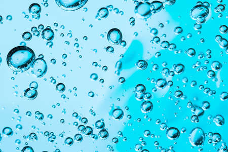 Close-up of water bubbles in clear blue liquid, abstract art. Refreshing and purity concept