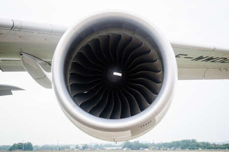 Closeup of airplane jet engine. Rotating blades part of airplane travel concept