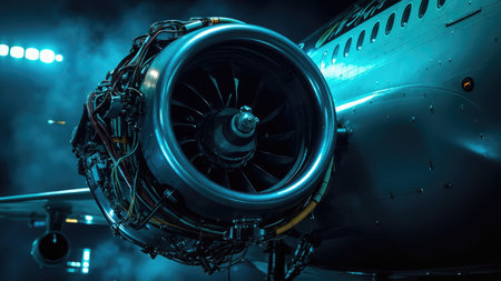 Close-up detail of a powerful airplane engine, dramatically lit in dark blue. The intricate mechanics and complex design are highlighted, showcasing the industrial power and technological sophistication of aviation engineering. Perfect for themes of travel, speed, and advanced technology.