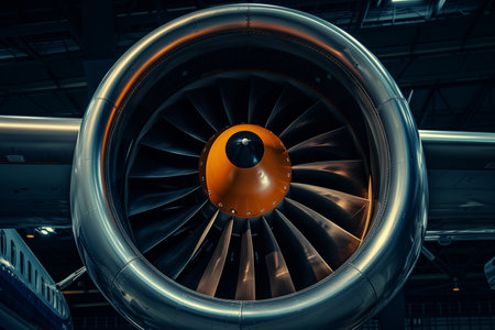 Close-up detail of a powerful jet engine undergoing maintenance within an aircraft hangar. The image showcases the intricate engineering and powerful mechanics of modern aviation technology. Ideal for illustrating concepts related to aerospace, aviation maintenance, or industrial machinery.