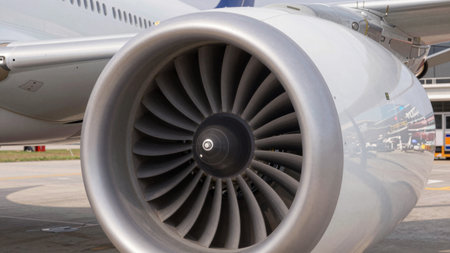 Close-up detail of a powerful jet engine, showcasing its intricate metal components and sophisticated engineering. Illustrates industrial technology, aerospace innovation, and the mechanics of modern aviation. Ideal for concepts related to power, speed, and advanced manufacturing.