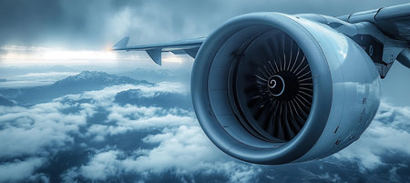 Detailed close-up view of an aircraft turbine engine showcasing its intricate design and engineering. The industrial backdrop enhances the aviation theme.
