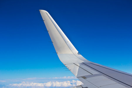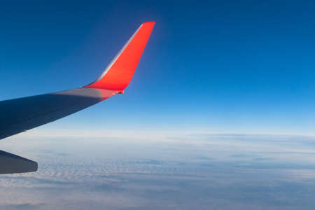 Adventure, travel, transport concept. View from plane window at clear sky and wing