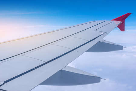 Adventure, travel, transport concept. View from plane window at sky with clouds and wing