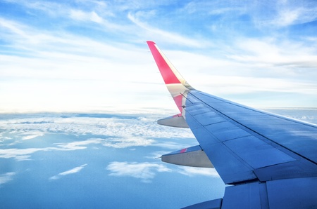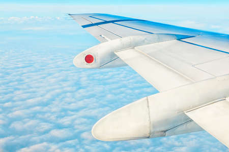 Aerial wing airplane. Views through the window of an airplane. Cloudy light blue sky. Concept of travel, holidays and vacations.