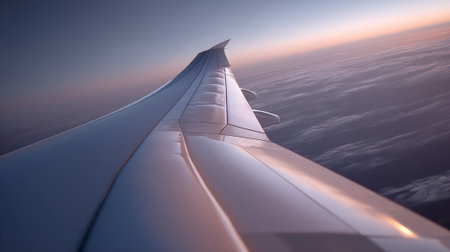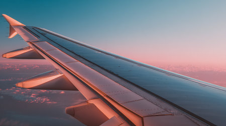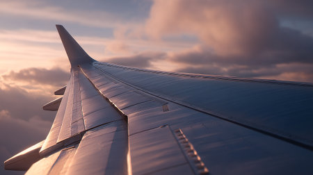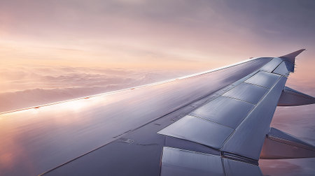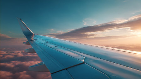 Airplane wing soaring through the sky during a breathtaking sunset flight