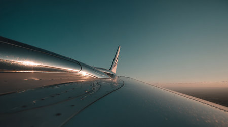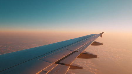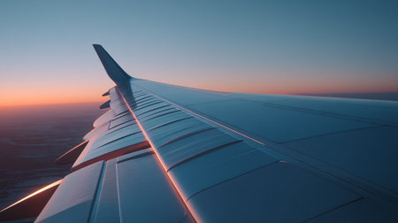 The wing of an airplane soaring through a clear blue sky during sunrise