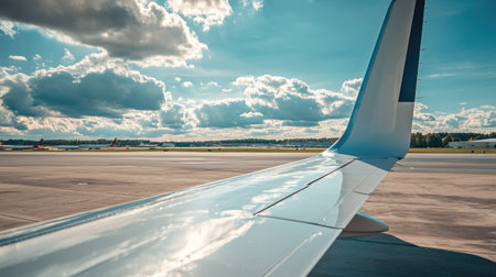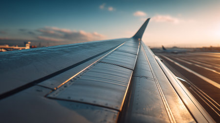 Generative AI : Wing of an airplane taking off on run way in terminal with clouds at sunset blank copy space