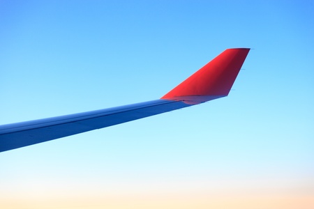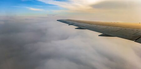 View from the airplane window at a beautiful blue sunrise and the airplane wing above the clouds. Clouds and sky as seen through window of an airplane.