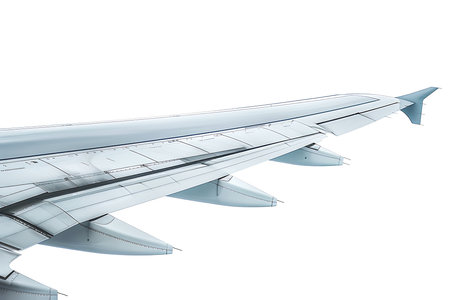 Close-up image of a commercial airplane wing with a transparent background. Perfect for aviation, travel, and transportation themes, capturing the sleek modern design and engineering of an aircraft.