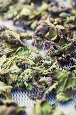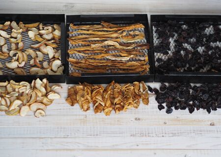 Black lattices from a home dryer of fruits and vegetables with different dried fruits. Homemade harvesting of apples, melons, plums, peppers.
