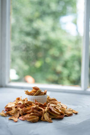 Dried orange slices background. Dehydrated crispy fruit slices. Pile of sun-dried crunchy oranges. Healthy meal snack. Top view.