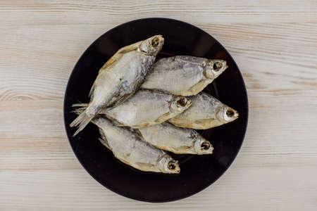 beer snack: 6 sun-dried freshwater salt fish on black plate - a source of vitamins and protein, gray table, Central location