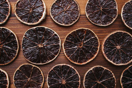 Slices of dry oranges. Raw citrus fruits pattern background. Flatlay, top view.