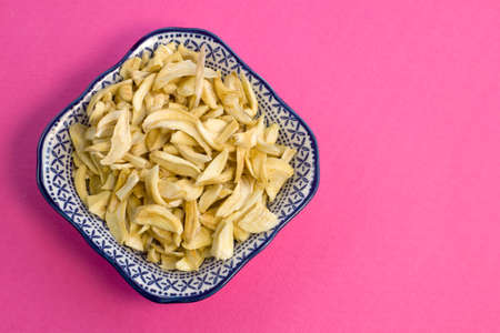 Dried garlic flakes on blue plate close up flat lay photo on pink textured background top view