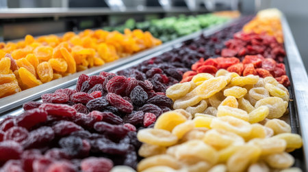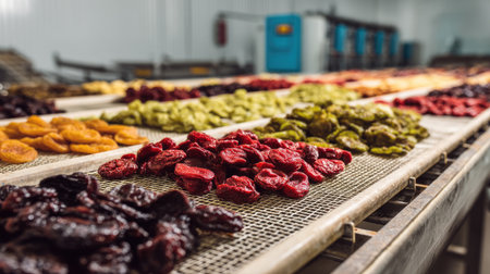 Image showcases an array of freshly dried fruits arranged on drying racks within a vibrant food processing facility, highlighting the art of fruit preservation.